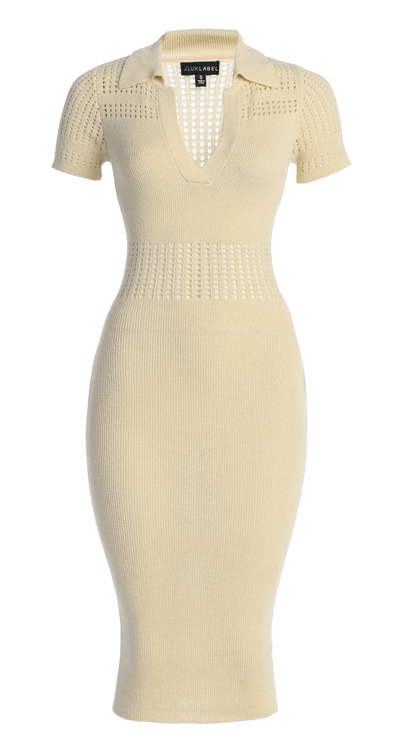 You’ll be completely drawn to our Buttercream Venice Collared Midi Dress. This versatile midi dress showcases a classy collared neck with short sleeves and a curve hugging silhouette. Crafted in a blend of knit and see-through crochet material, this transitional staple can be worn through the seasons. Single lined. Stretchy.