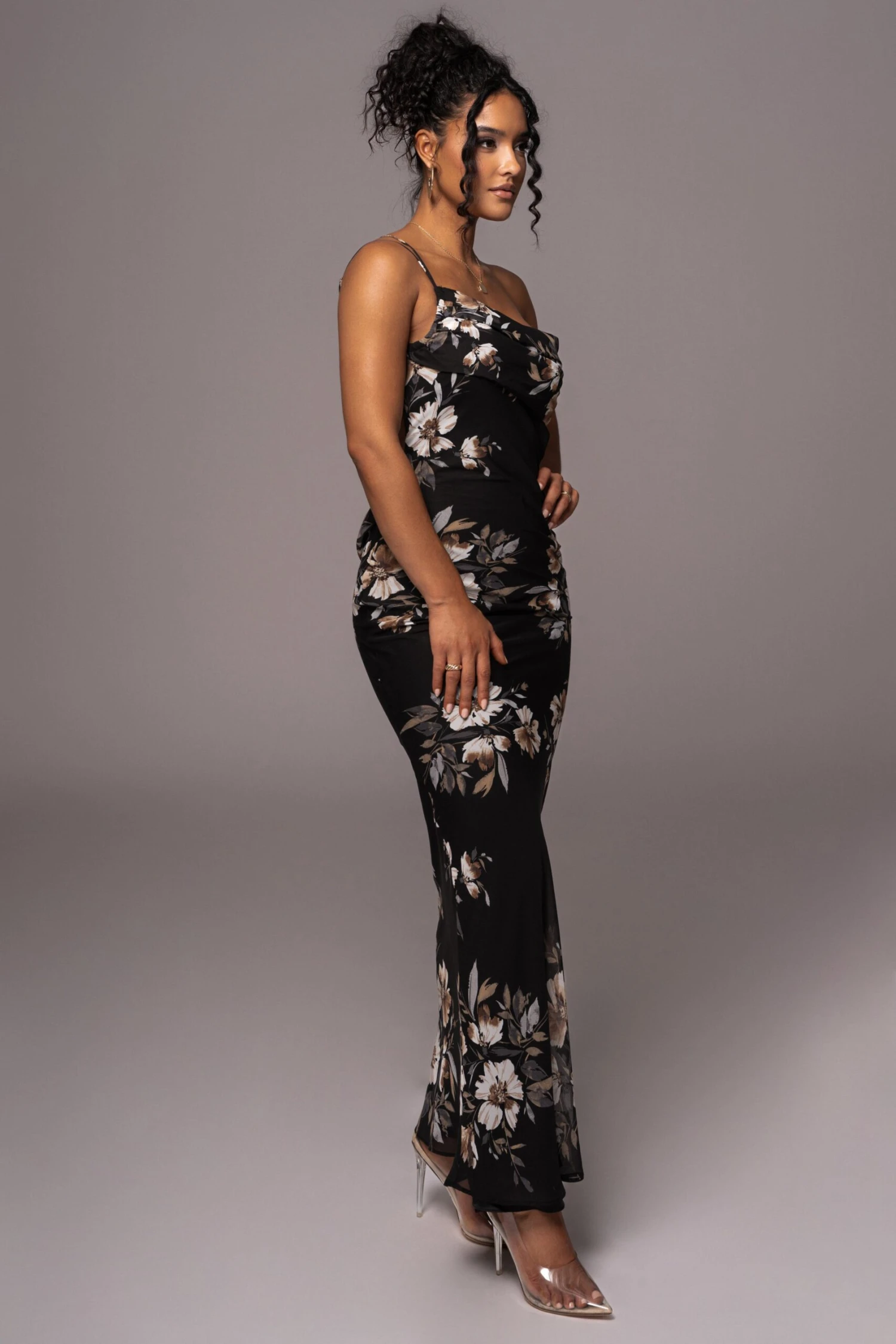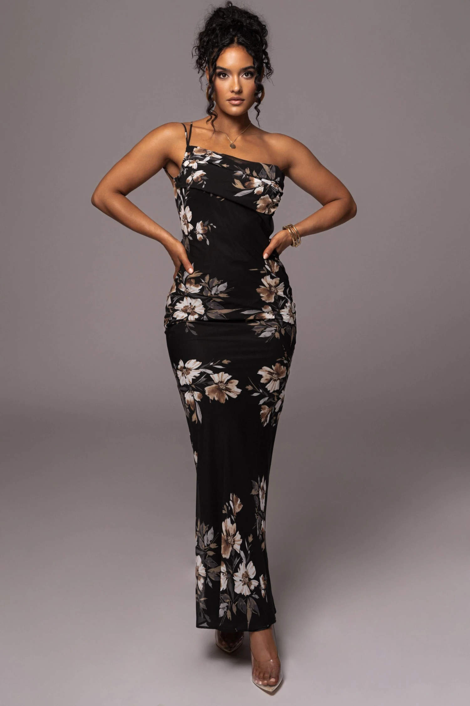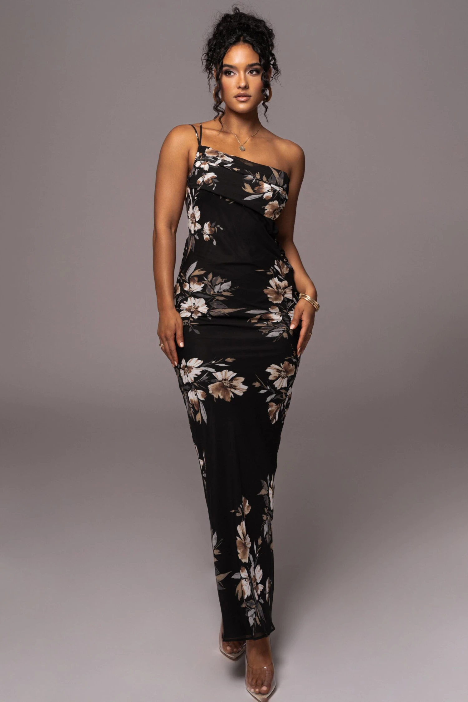 Our new Grey Floral Treasure One Shoulder Dress serves timeless glamour in a breathable maxi design constructed of lightweight chiffon. Featuring a one-shoulder neckline with an adjustable back strap, a cowl back detail, and maxi hem. Constructed in a light chiffon fabric graced with a dreamy and everlasting floral pattern. Lovely ruching at the bust and lower back add extra charm. Lined interior.