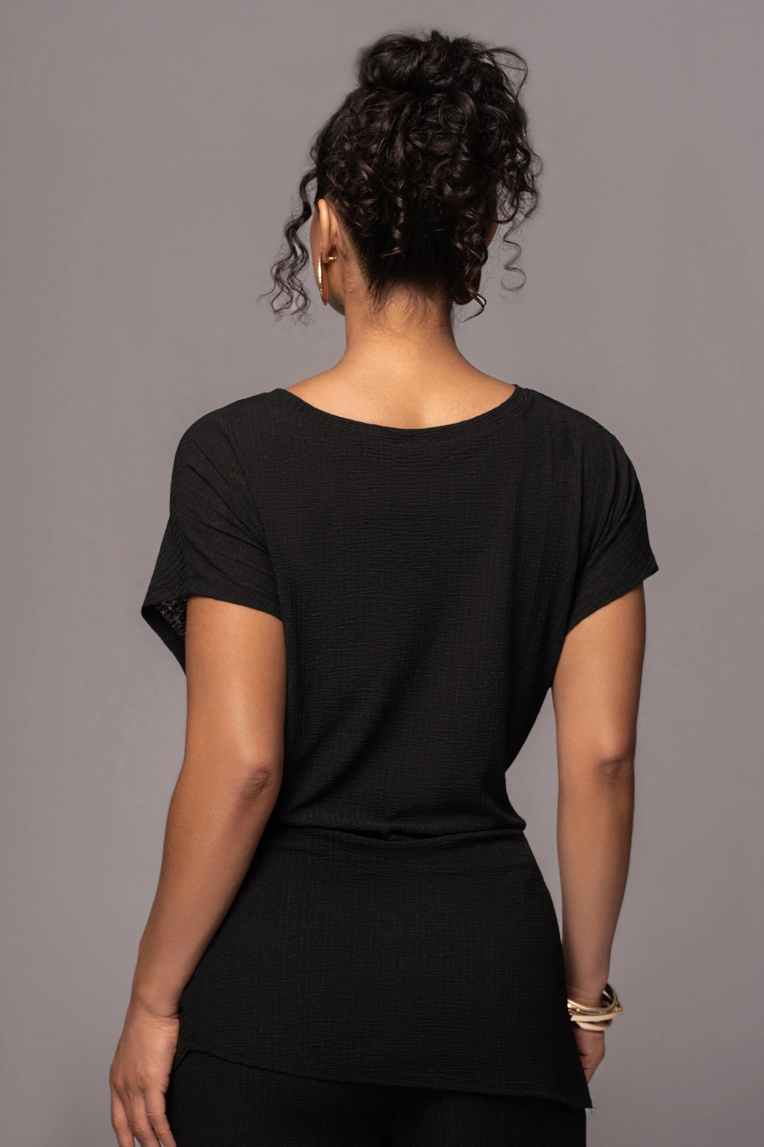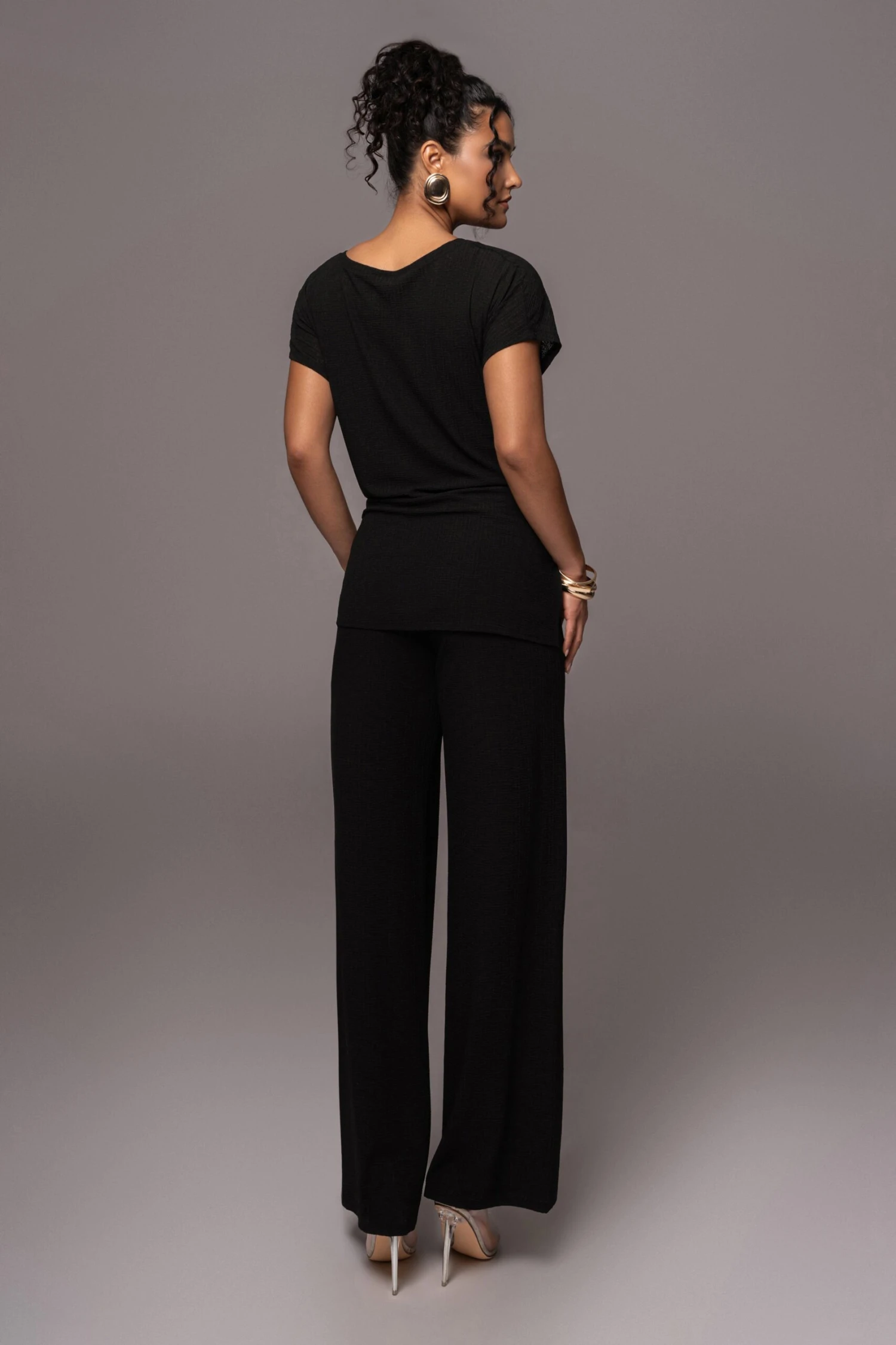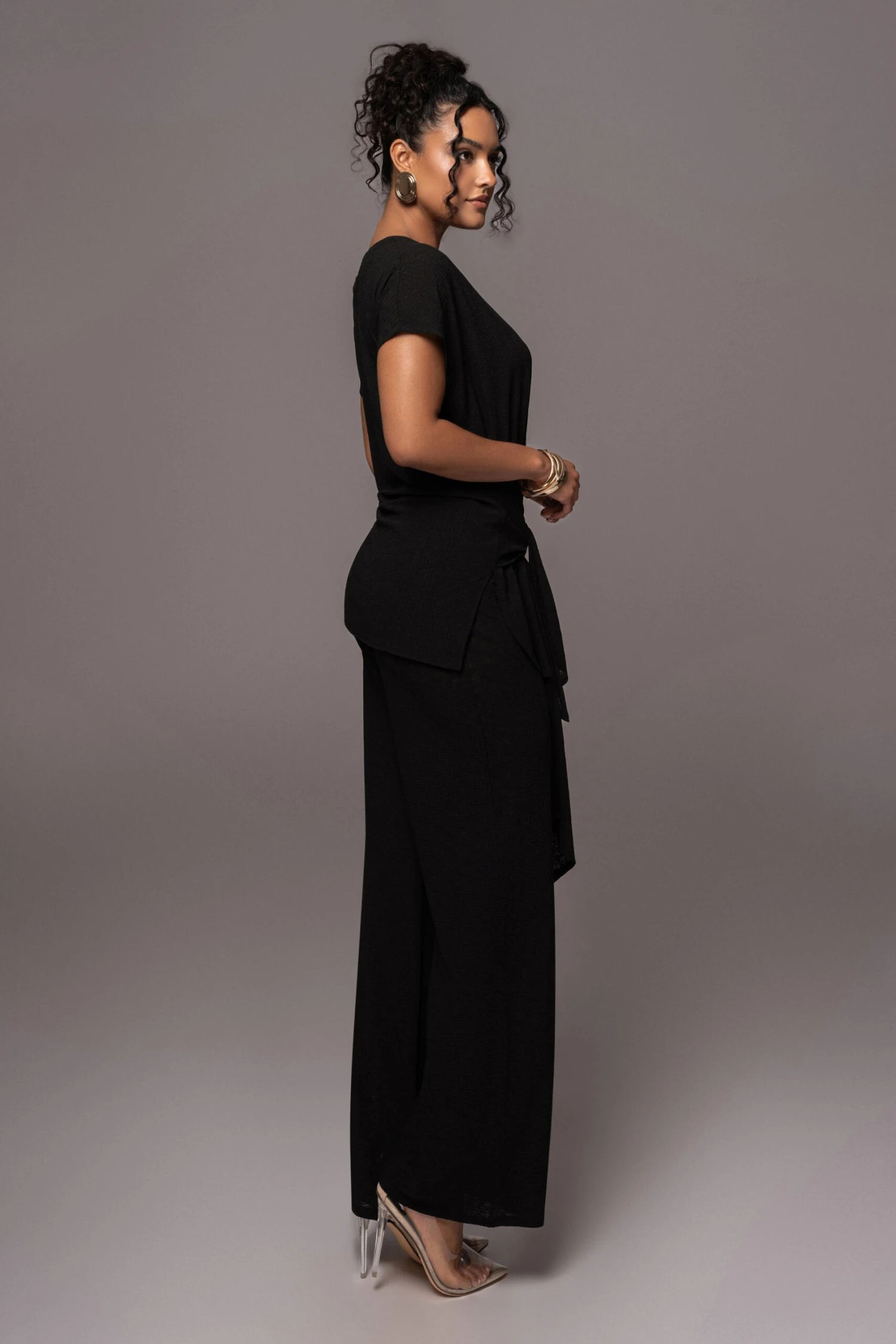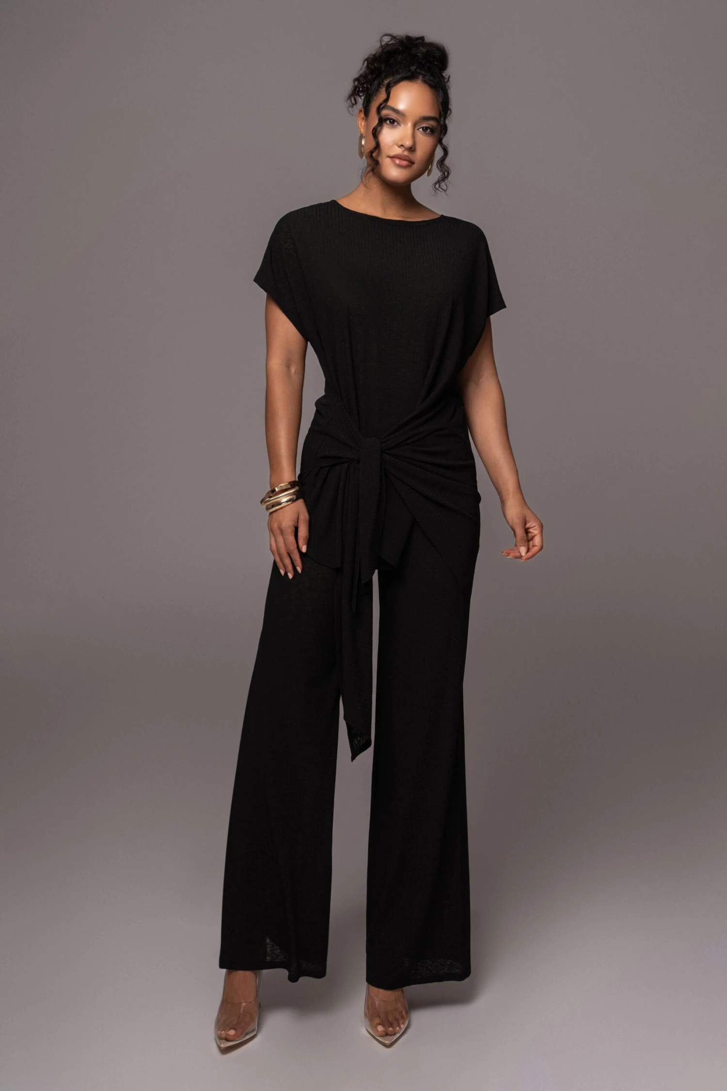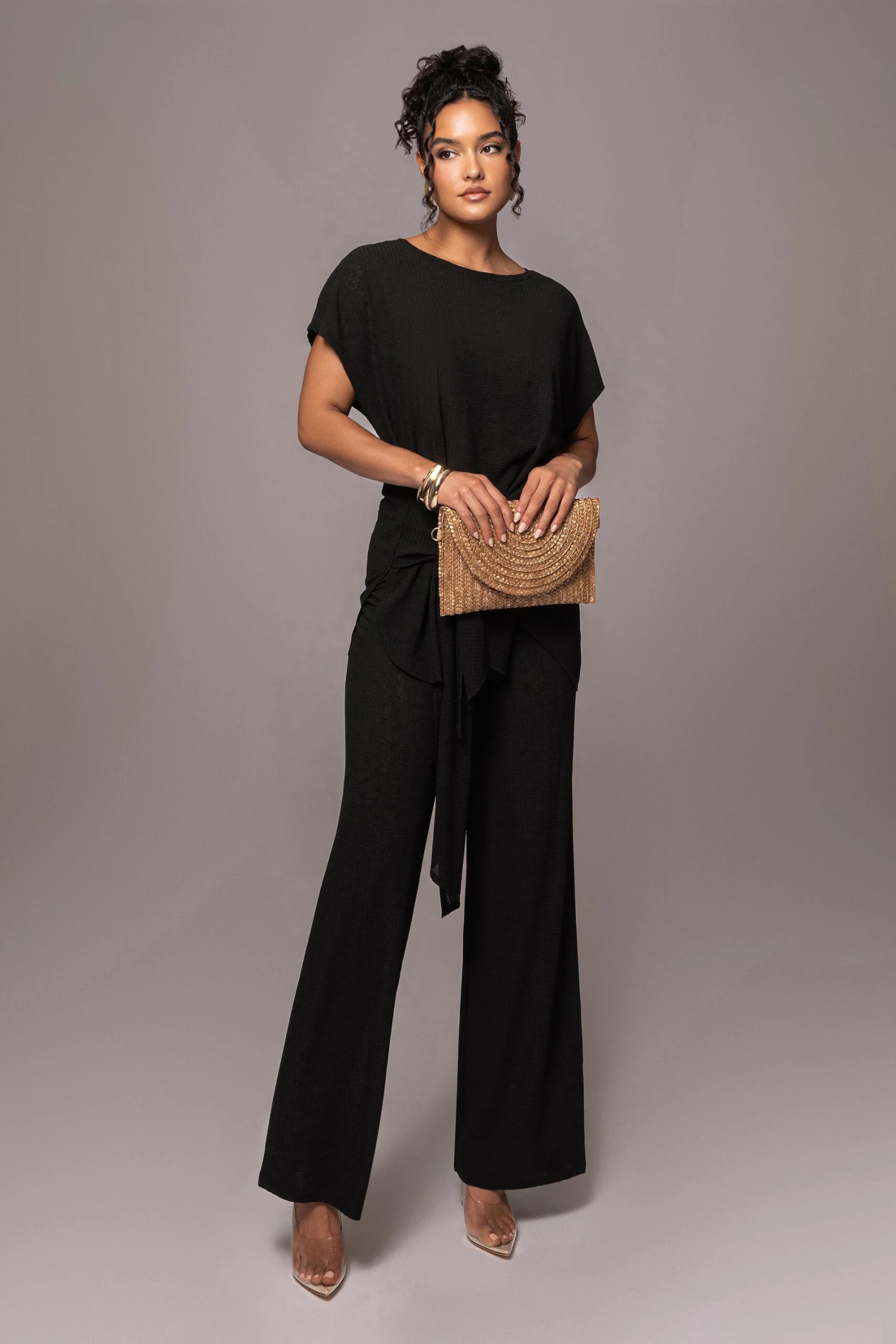 Our Noir Chase The Sun Two-Piece Set is here to stay all summer! This stylish pant set features an oversized sleeve top with front wrap design. The matching pants come with an elastic waistband and classic straight legs for an instant day to night look. Stretchy. Single lined. Sold as set.