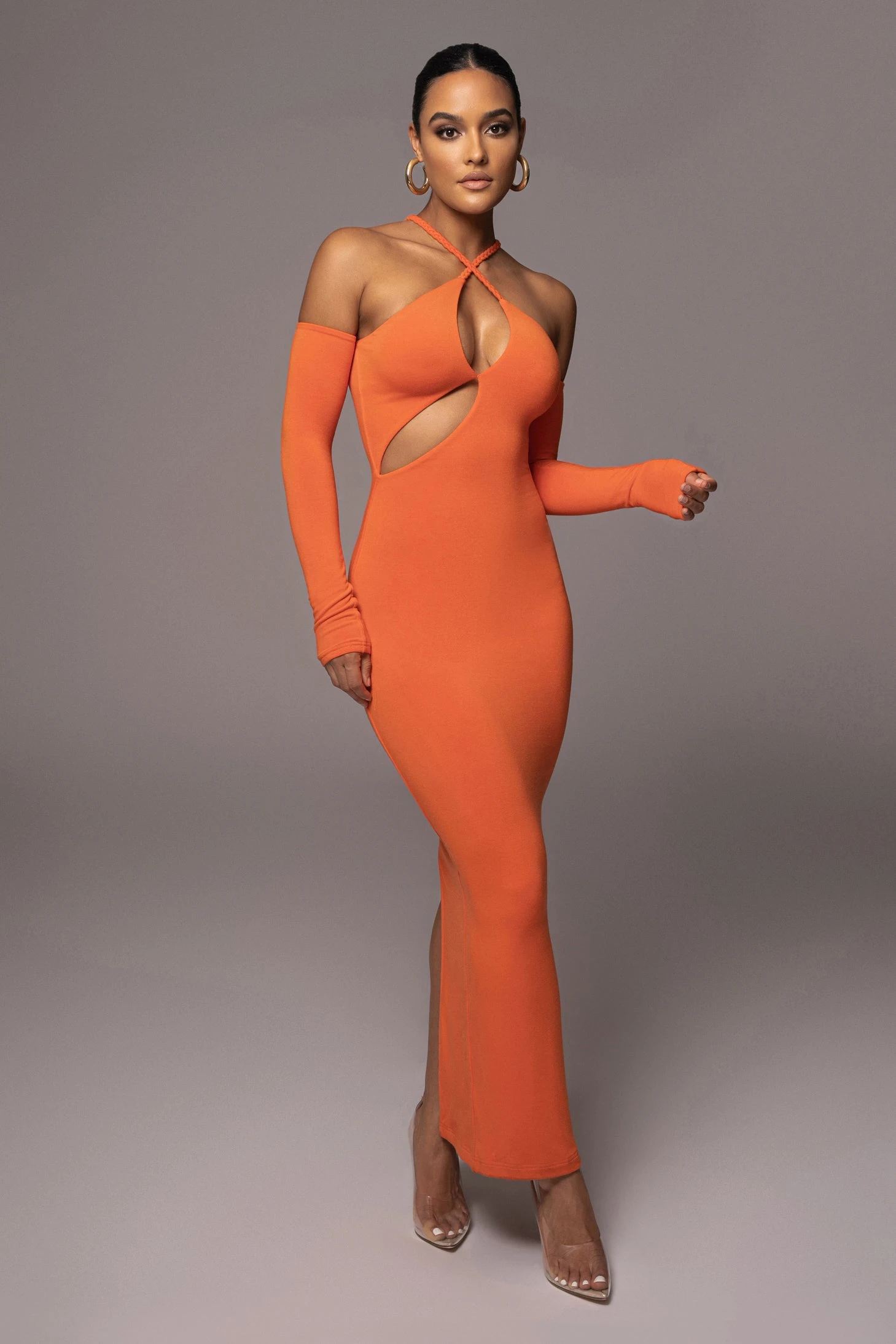 The Orange Soledad Cross Maxi Dress blends edge with femininity in this desirable skin-tight maxi dress featuring a beautifully braided criss-cross neckline with removable off-the-shoulder sleeves and chest cutouts. Designed in our double-lined fabrication achieving an effortlessly sculpted fit with ultimate appeal. Hidden back zipper closure. Stretchy.