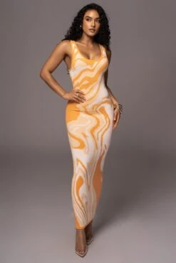 Escape to a tropic state with our Orange Tropicana Tank Maxi Dress. Crafted of a soft knit material, this playful maxi dress features a classic scoop neckline with tank shoulders, and a wavy print of white and orange shades that make it the perfect summer choice. Stretchy.