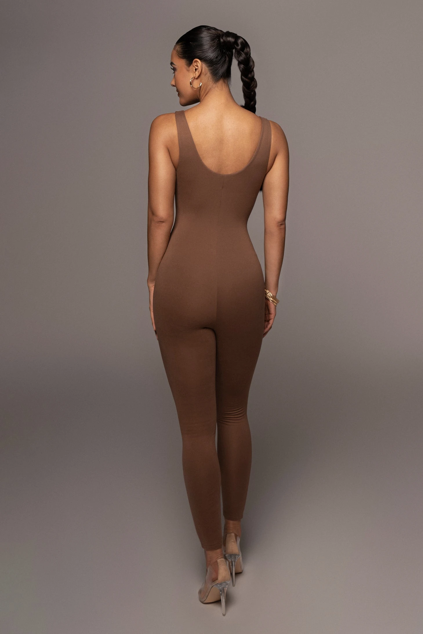 EXCLUSIVELY DESIGNED BY US FOR YOU. All eyes are on you when out in the PECAN ALO DOUBLE LAYER JUMPSUIT! This versatile, sleeveless jumpsuit features a body forming silhouette with a low scoop neck, tank shoulders, and skinny leg hems. Designed in smooth double lined jersey fabric for compression support. Style it as a layer or by itself, either way, your look will be irresistible! Stretchy.
