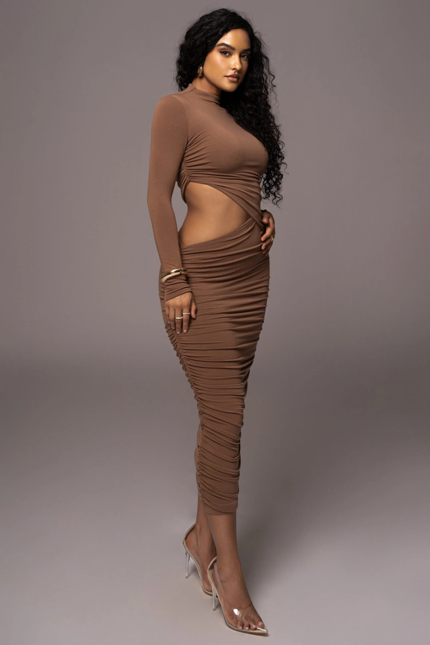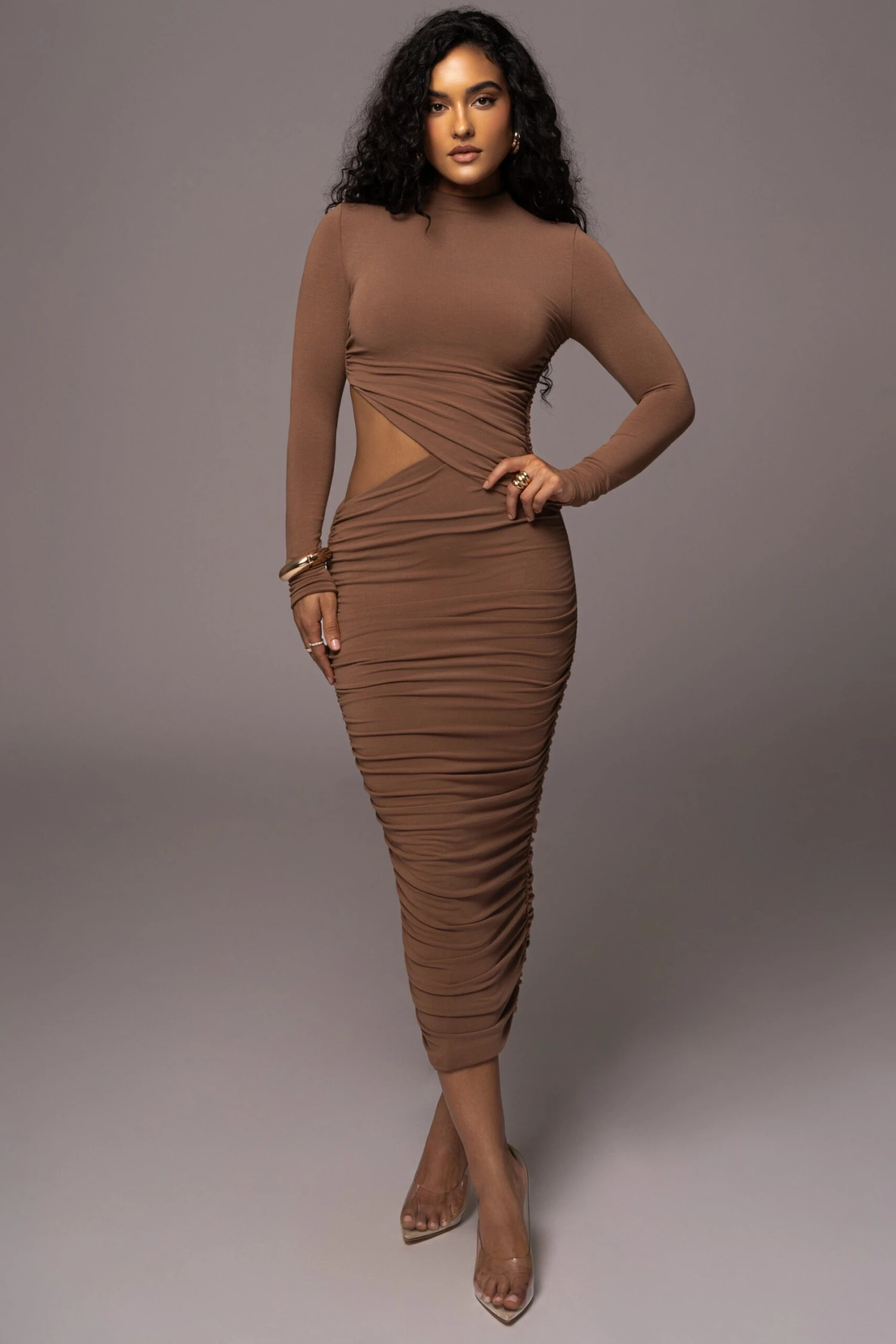 Introducing our Pecan Clear Skies Mock Neck Dress – an embodiment of refined elegance. This versatile midi dress features a mock neckline, long sleeves arms, and a stylish asymmetrical cutout located towards the right waist. Flattering ruching throughout gracefully elevates this piece with texture. Stretchy. Double-lined.