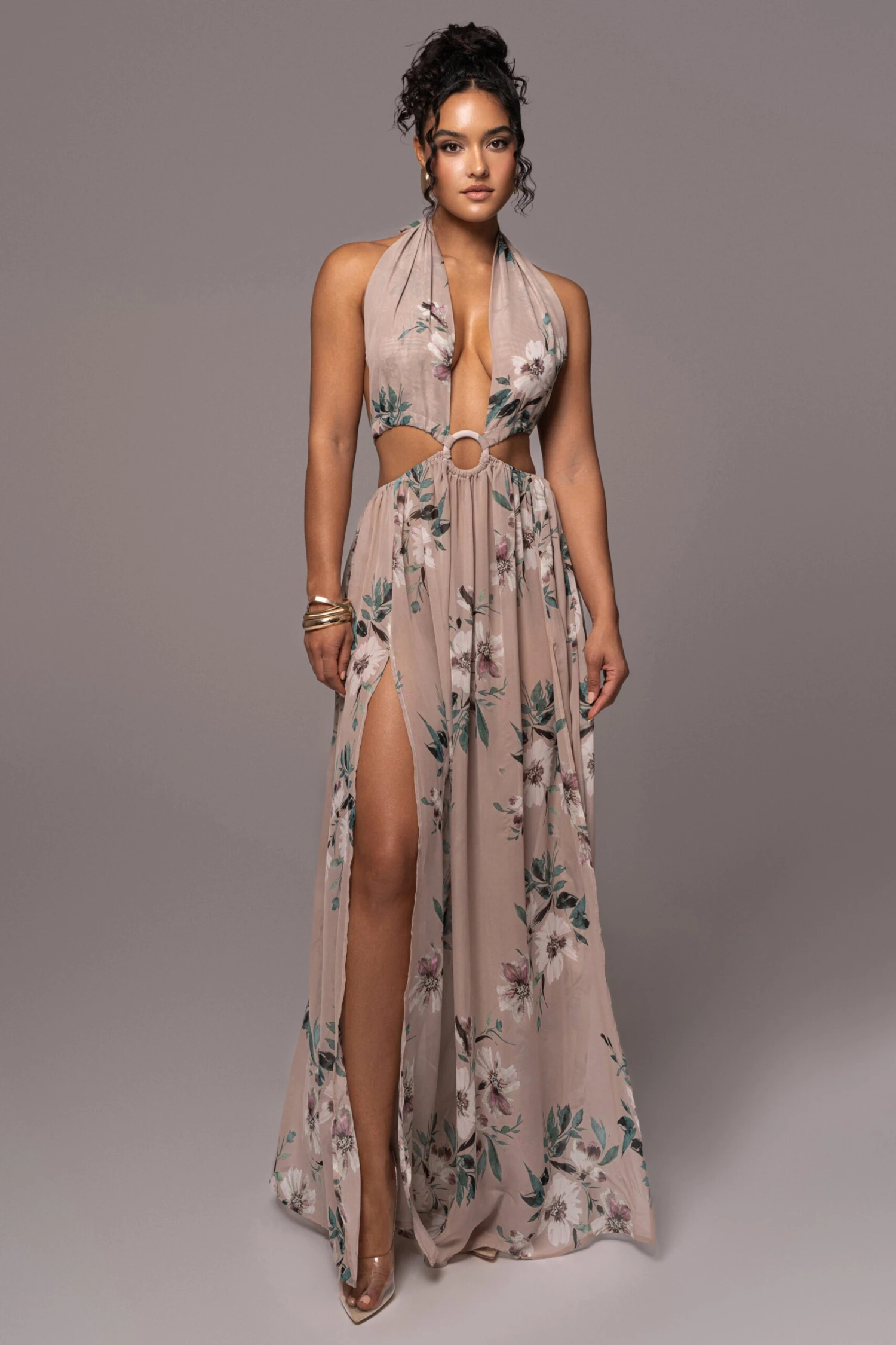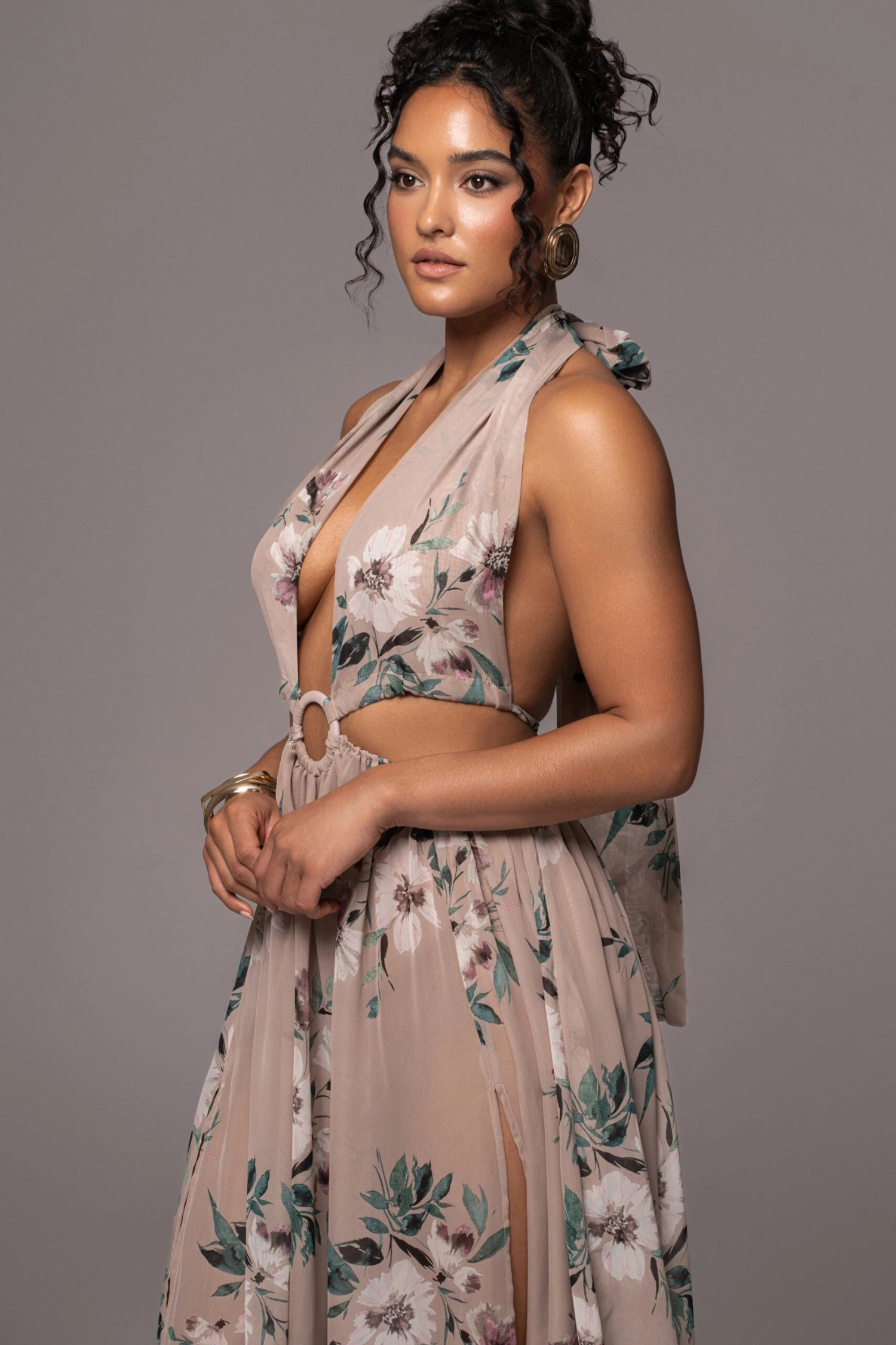 Step back and take in the beauty of our Purple Floral Nicoletta Chiffon Maxi Dress. The perfect cover up for your summer days is here. Achieve light and breezy style in this plunging maxi dress showcasing a lovely floral pattern with a halter neckline, a high front slit, and an elastic waist. The center of this maxi details a keyhole design with cut-out sides and back waist ties. Stretchy. Single Lined.Â