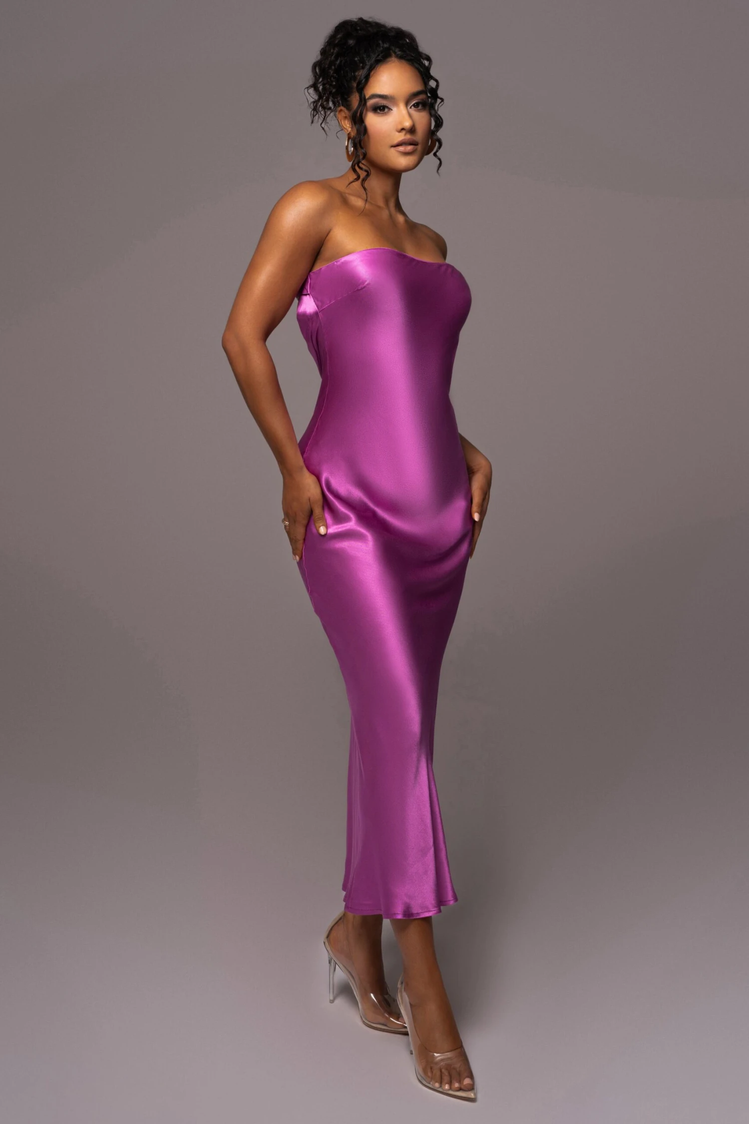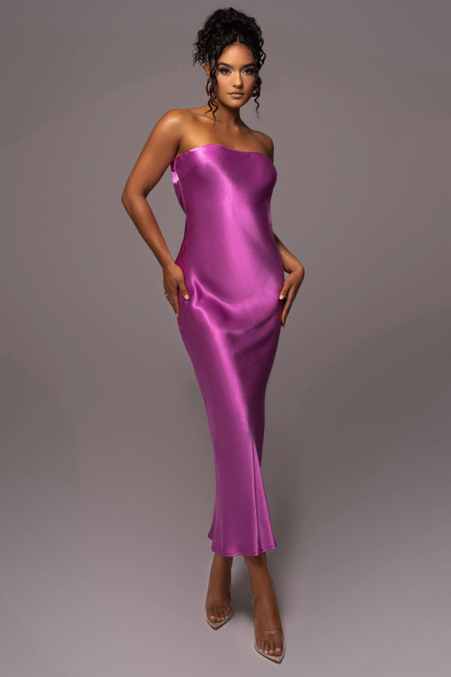 Radiate on all angles with our new Purple Irina Satin Maxi Dress. This beautiful maxi design features a strapless neckline with a stylish tie back closure and a flattering silhouette that falls effortlessly around your curves. Crafted in a smooth satin fabric for ultimate shine and elegance. No stretch.
