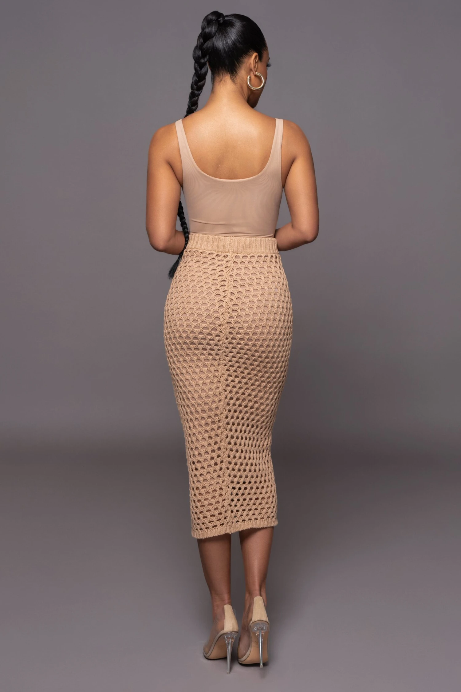 Luxuriate under the sun with our Sand Sunkissed Knit Skirt. This stunning crochet midi skirt features a sophisticated pencil silhouette with an elastic waistband and beige lining creating a nude illusion. Double lined. Stretchy.