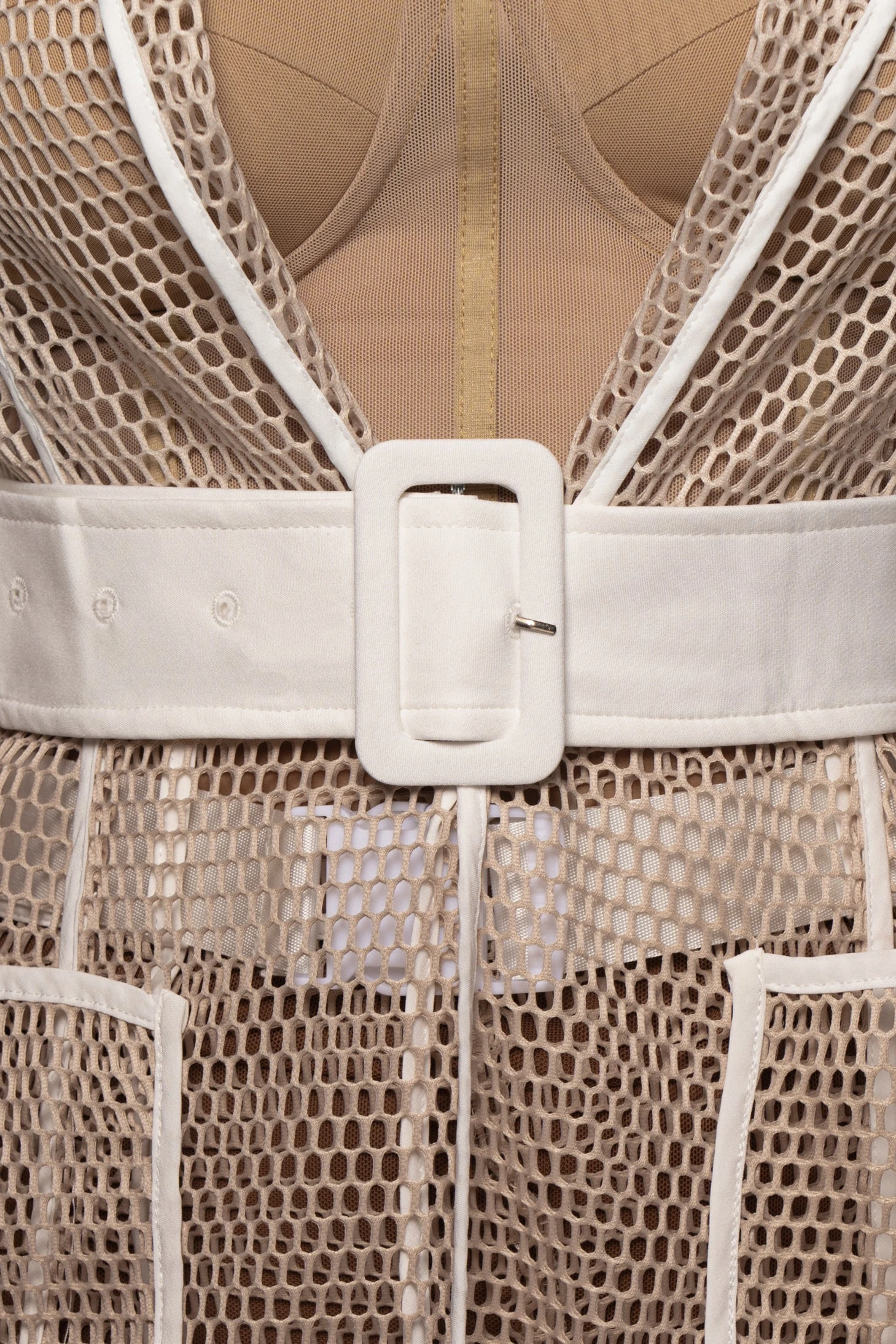 EXCLUSIVELY DESIGNED BY US FOR YOU. What’s not to love about our BEIGE BEXLEY COAT. Designed in a knitted mesh, this trend setting coat comes with stylish notch lapels, long sleeve arms, two functional welt pockets, and an open front with matching belt detailing a squared acrylic buckle. White contrast stitching throughout to finish the look. Pair with the