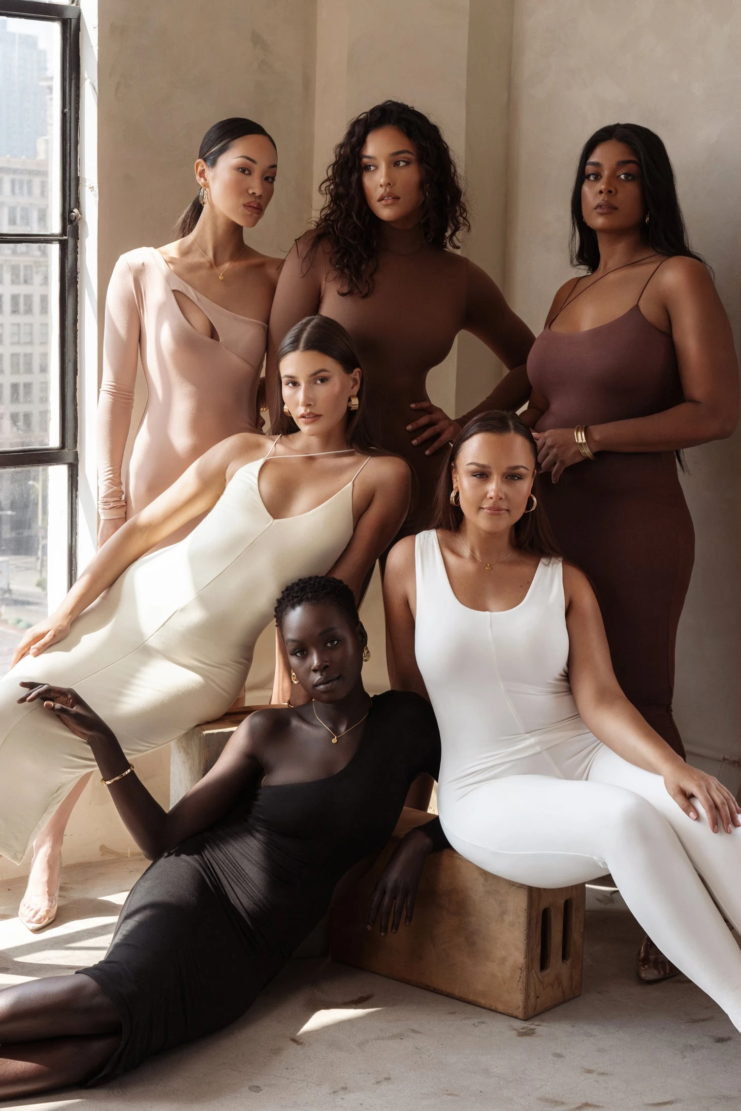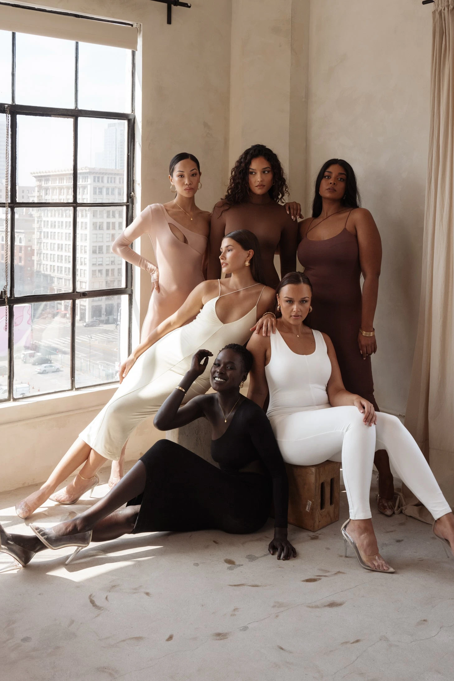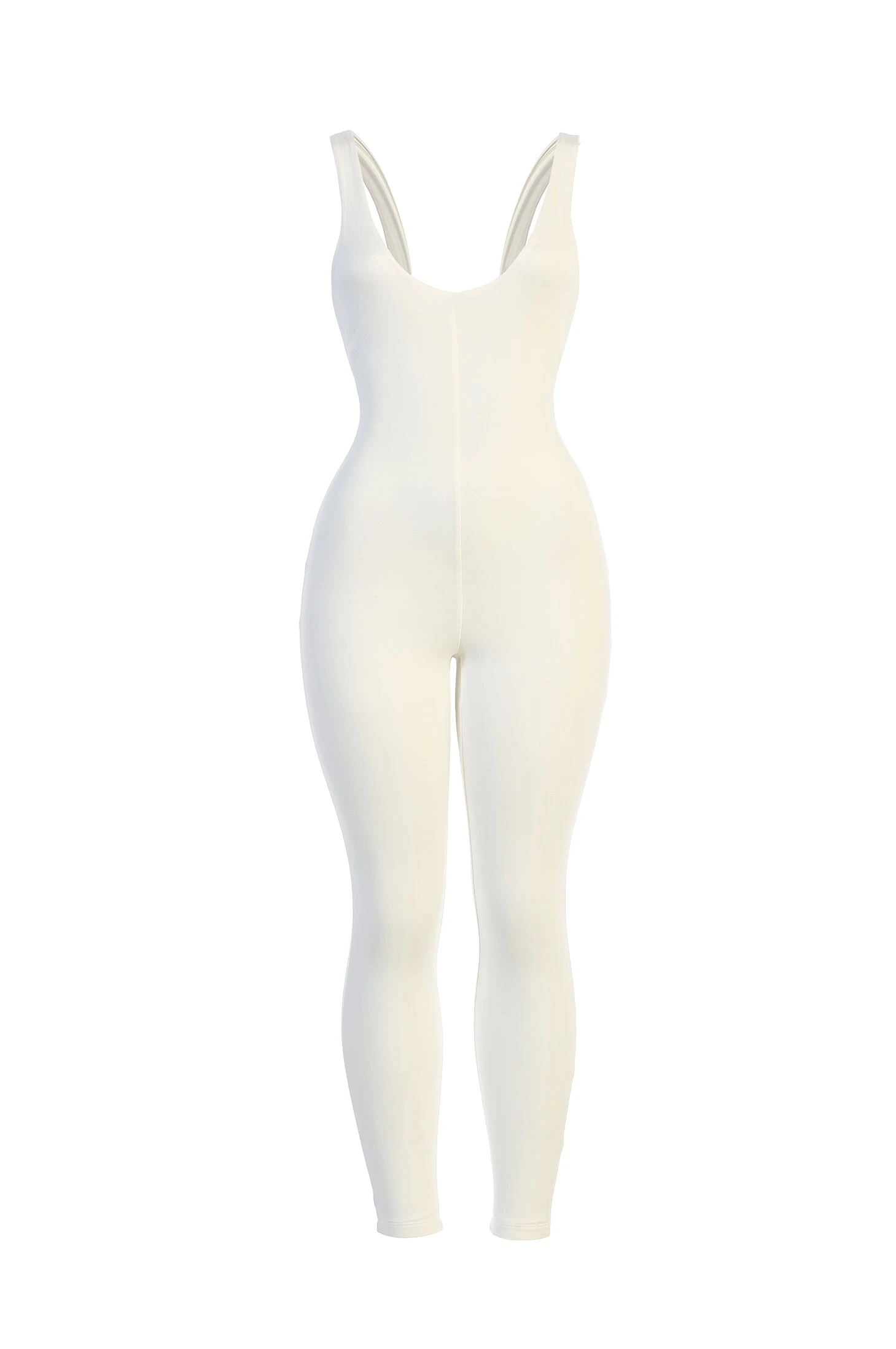 EXCLUSIVELY DESIGNED BY US FOR YOU. All eyes are on you when out in the WHITE ALO DOUBLE LAYER JUMPSUIT! This versatile, sleeveless jumpsuit features a body forming silhouette with a low scoop neck, tank shoulders, and skinny leg hems. Designed in smooth double lined jersey fabric for compression support. Style it as a layer or by itself, either way, your look will be irresistible! Stretchy.