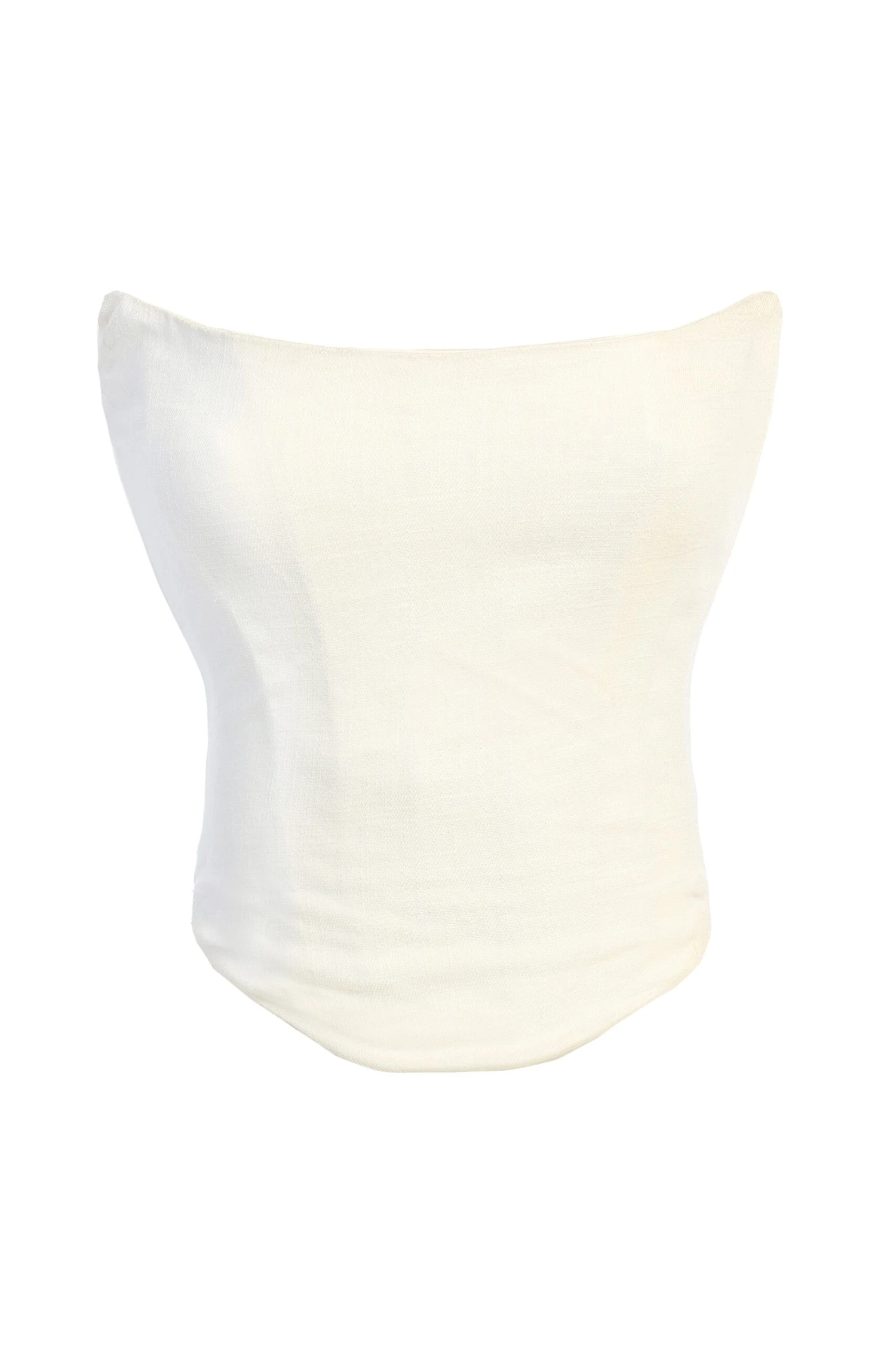 You’ll be the epitome of style when wearing our Ivory Fenix Reversible Linen Corset. This eye catching corset showcases a strapless neckline with boning throughout the front and back for added structure and support. Crafted in a Cotton/Linen blend, this corset top is designed with a reversible feature consisting of a flattering front with boning detail and the other with a solid bodice for a smoother look. Complete with an elastic back for flexible fitting. Gold tone zipper closure. Stretchy.Â