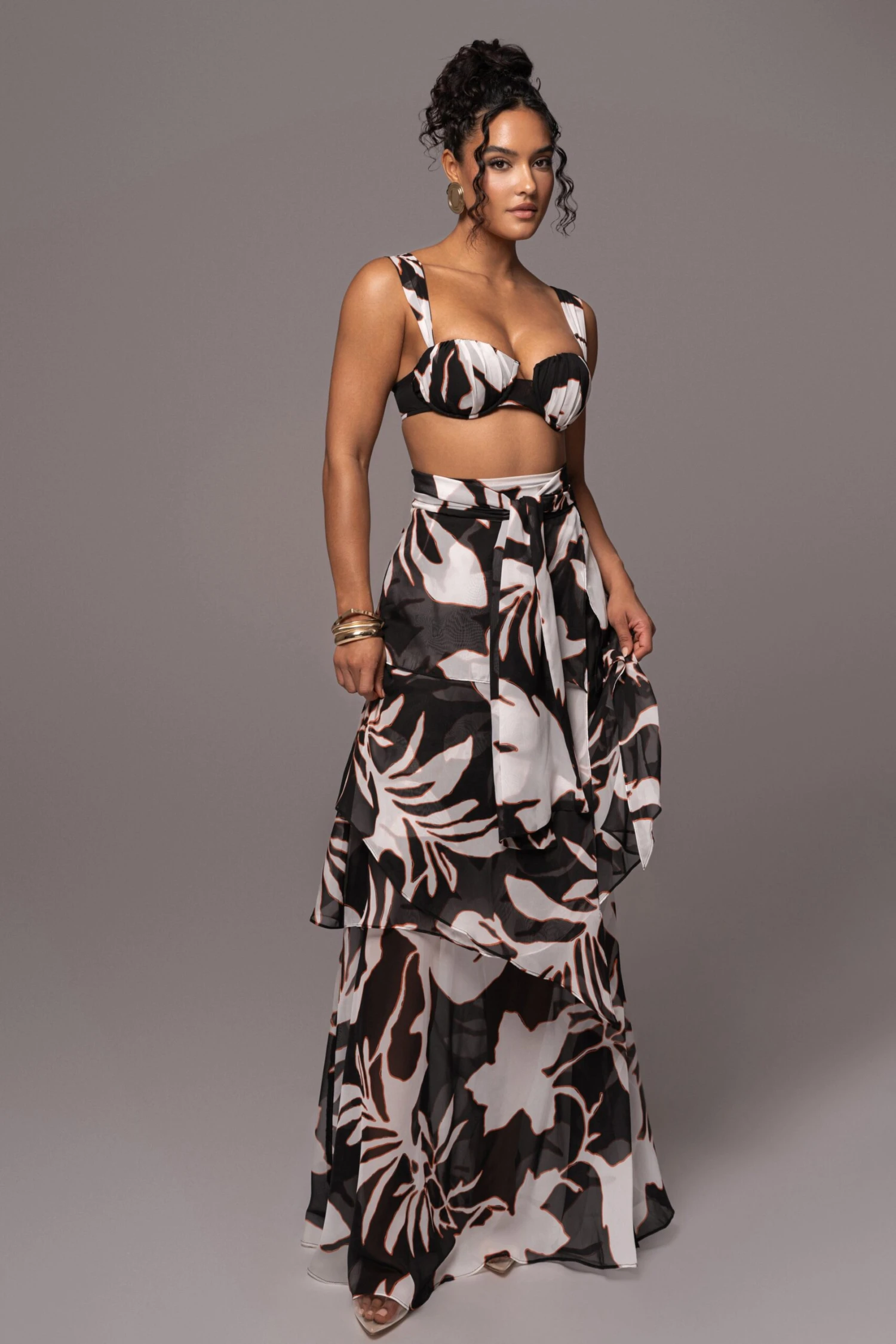 Our White Floral Printed Love Two-Piece Set sets a romantic tone all summer in a lovely floral pattern. Featuring a pleated bra top with padded cups, adjustable shoulder straps, and hook and eye closures. The matching skirt features a tie waistband and ruffled tiers cascading down to the maxi hem. Crafted in breathable chiffon material keeping your style on a fresh note all season. Single lined. Sold as set. Minimal stretch.