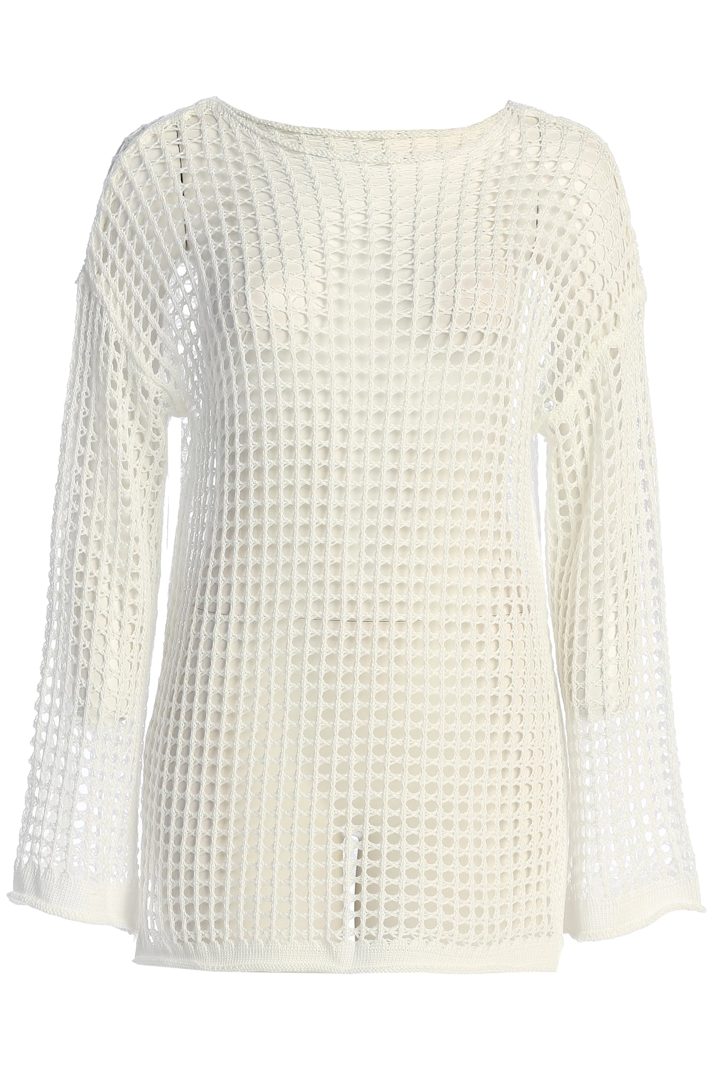 Our new White Izara Crochet Top is ready for paradise. Crafted of soft lightweight knit, our newest top features a see-through design with a round neckline and long sleeve arms. So versatile, this top converts into the perfect summer cover up! Relaxed fit. Stretchy.